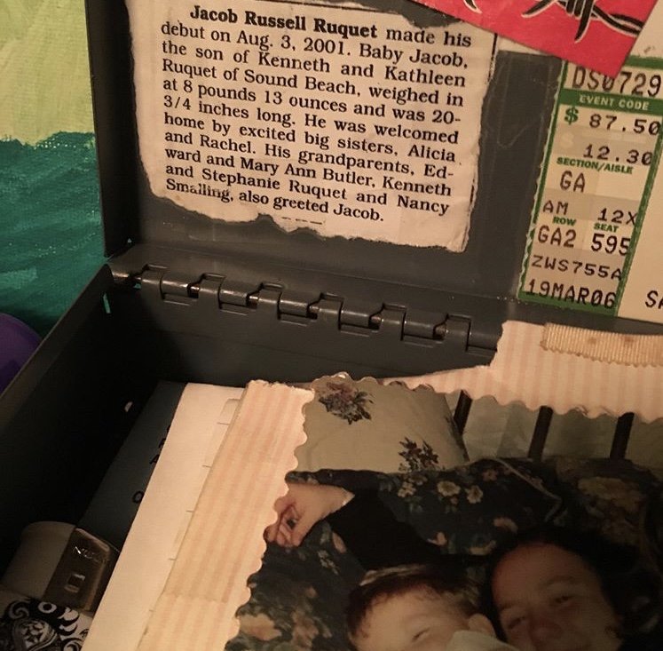 There were some people close enough to Alicia to know that she had a tiny lock box that was filled with CRAZY COOL and unexpected items, photos, pieces of writing, drawings… things that she kept near and dear to her. It was very clear that she was ecstatic about Jacob Ruquet’s birth as she welcomed her newest and youngest brother to the clan. The photo here displays a clipping she took out of a newspaper after Jacob was born and pasted it into her lock box, along with many photos of her and Jacob in the box. She loved her family more than anything.